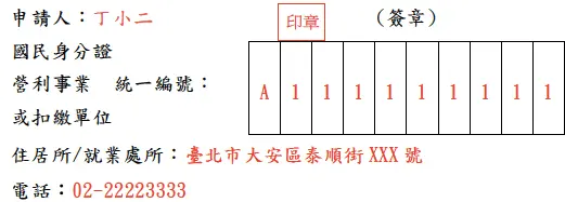 填寫「申請人姓名」、「簽章」、「身分證字號」、「住址」、「電話」。