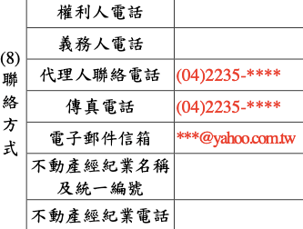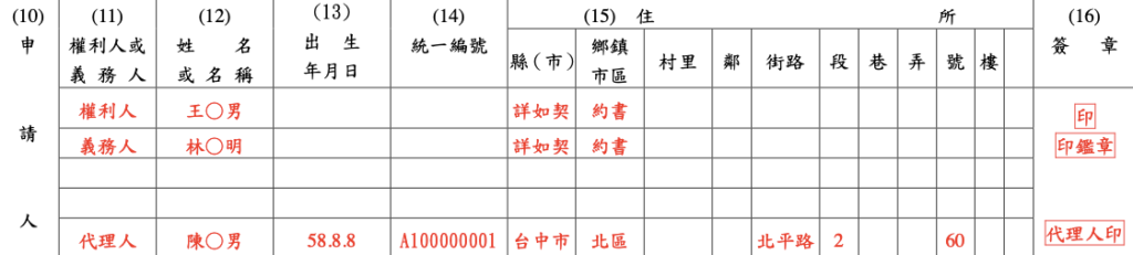 填寫權利人資訊(姓名/名稱、住所可以寫詳如契約書、蓋章)、義務人資訊(姓名/名稱、住所可以寫詳如契約書、印章要使用和印鑑證明相同的章)、代理人資訊(姓名、出生年月日、身分證字號、住所、蓋章)。