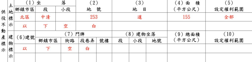 填寫土地標示(坐落、地號、地目、面積、設定權利範圍),空白欄位可以斜線劃除或填寫以下空白。