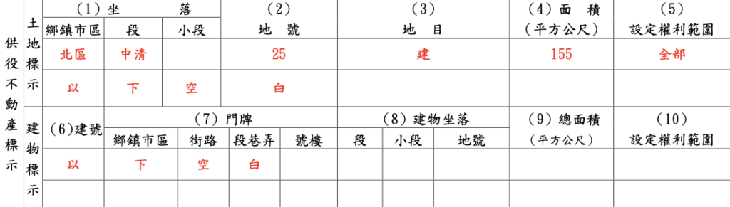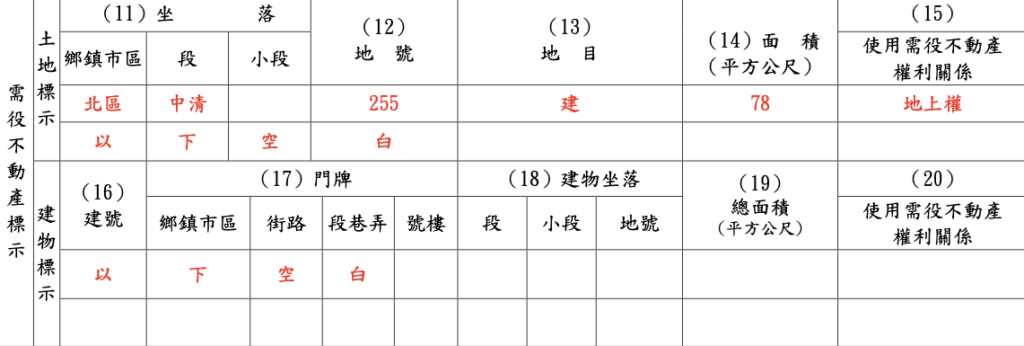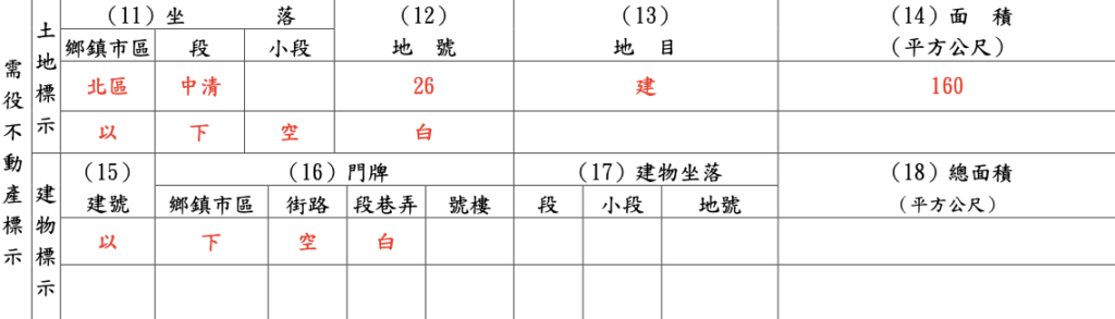 填寫土地標示(坐落、地號、地目、面積),空白欄位可以斜線劃除或填寫以下空白。