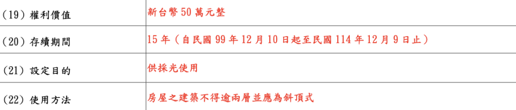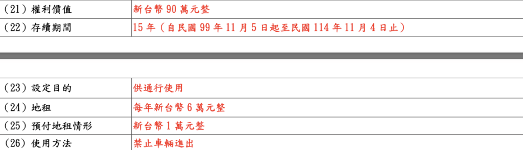 權利價值、存續期間、設定目的、地租、預付地租情形、使用方法