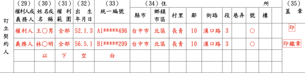 填寫權利人和義務人的資訊(姓名、權利範圍、出生年月日、身分證字號、住所),權利人蓋私章、義務人要蓋印鑑章。