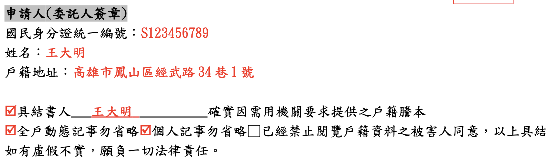 填寫「申請人身分證字號」、「姓名(簽名或蓋章)」、「戶籍地址」。