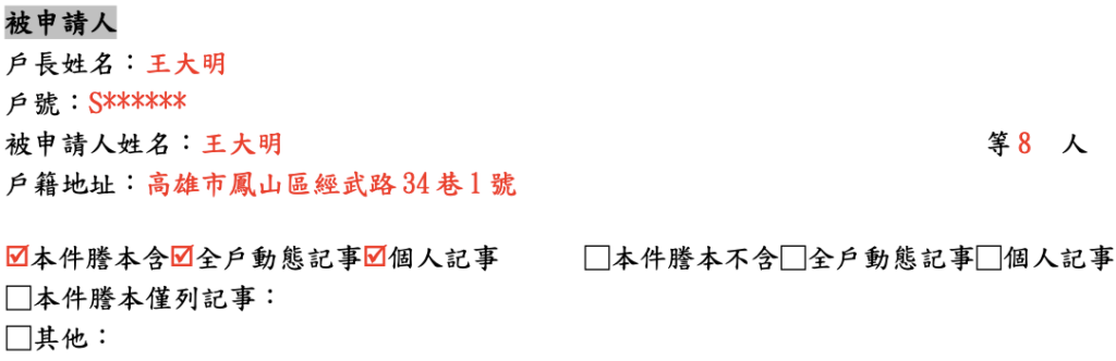 填寫被申請人的資訊,包含「戶長姓名」、「戶號」、「被申請人姓名」、「戶籍地址」。