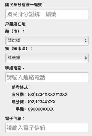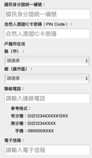 如果選「自然人憑證」,要輸入「身分證字號」、「自然人憑證 IC 卡密碼」、「戶籍地址」、「電話」、「Email」。