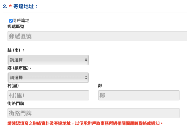 預設是勾選「同戶籍地」,如果通訊地址不同,要額外填寫。