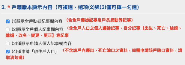 預設是選「顯示同戶動態記事欄內容」、「僅申請現住戶人口」。