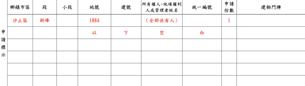 填寫「鄉鎮市區」、「段」、「地號」、「全部共有人」、「申請份數」。