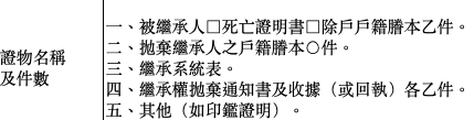 檢附「繼承系統表」、「繼承權拋棄通知書及收據」、「印鑑證明」。