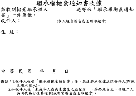 - 拋棄通知書收據(已通知因其拋棄應為繼承之人之證明)。