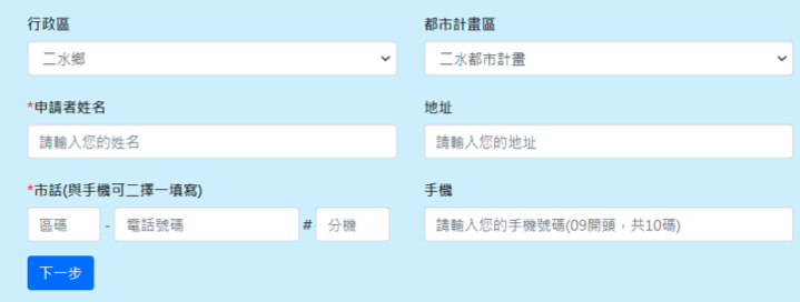 填寫「申請者姓名」、「地址」、「電話」、「手機」。