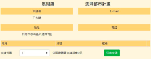 確認「行政區」、「都市計畫書」、「申請者」、「Email」、「地址」、「電話」、「地段」、「地號」、「檔名」、「申請份數」。
