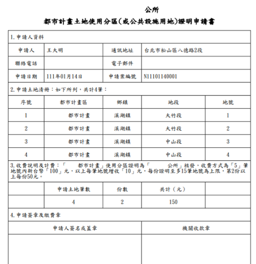 申請份數以 5 筆地號 100 元,超過以 10 元加收。每份證明書最多 15 筆地號,第 2 份 50 元。