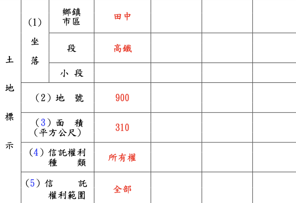 填寫「坐落」、「地號」、「面積」、「信託權利種類」、「信託權利範圍」。