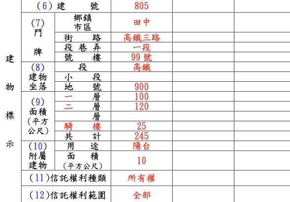 填寫「建號」、「門牌」、「建物坐落」、「面積」、「附屬建物」、「信託權利種類」、「信託權利範圍」。