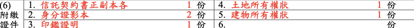 填寫「信託契約書正副本各 1 份」、「身分證影本 2 份」、「印鑑證明 1 份」、「土地所有權狀 1 份」、「建物所有權狀 1 份」。