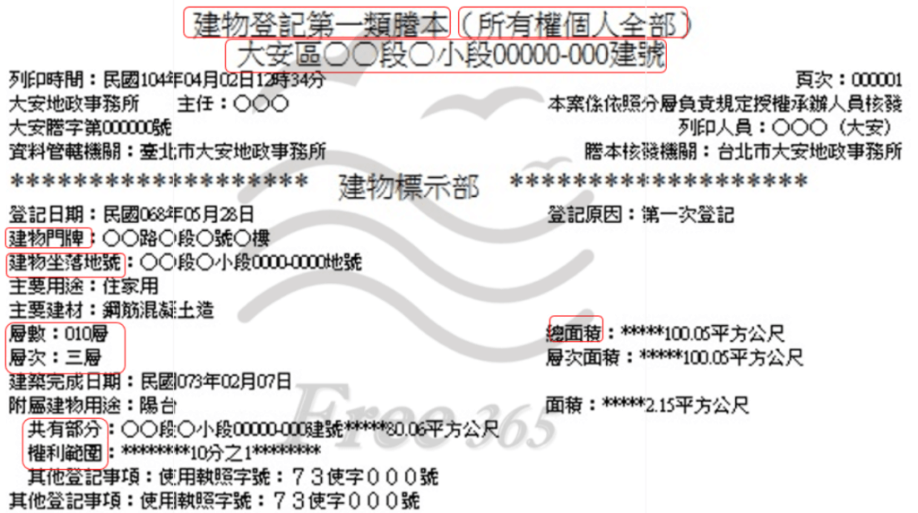 包括坐落、建號、門牌號、建築完成日期、主要建材、主要用途、建物層樓、層次(居住樓層)、面積(室內面積)、總面積、附屬建物及其面積(陽台、雨遮、露台等)。