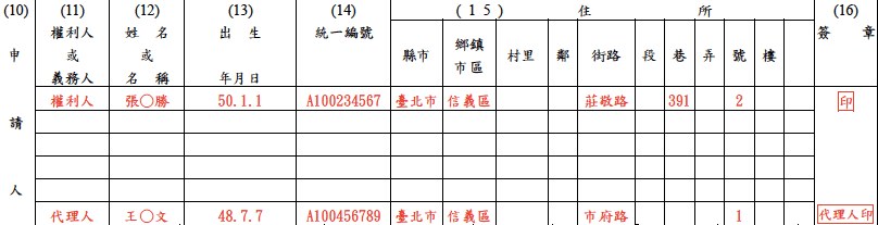 填寫「權利人資訊並蓋印鑑章」、「代理人資訊並蓋章」。