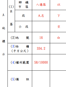 填寫「坐落」、「地號」、「面積」、「權利範圍」、「備註」。