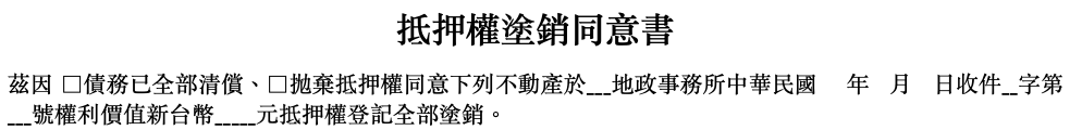 暨〈抵押權設定如何申請登記?〉和〈次順位設定抵押權給第三人和新青安有什麼關係?〉之後,來講回復原狀,就是如何塗銷他項權利登記,下面是用抵押權塗銷來舉例,但其他權利也是類似做法。