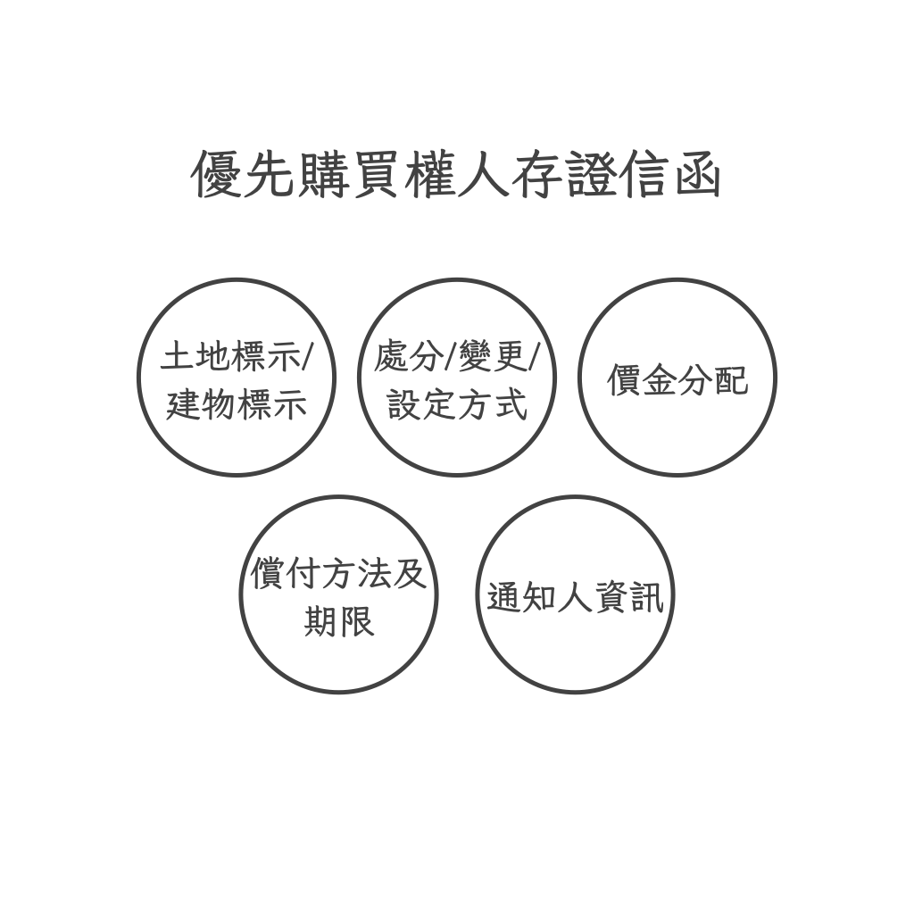 五、特別約定事項:本存證信函係依土地法第三十四條之一第一項規定處分共有土地依本法第二項、第三項規定通知他共有人,惟台端擬依同法第四項規定承買本人依前述標的土地應有持分時,請於文到十日以內以書面做意思表示,若由台端獲得優先購買權之資格時,本人自當於收到意思表示後之翌日另行通知台端日期,依同樣條件簽訂買賣契約並付清本人等土地應有持分價款。逾時本人將按前揭規定依土地法第三十四條之一第二項、第三項規定處理。